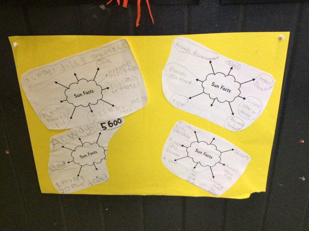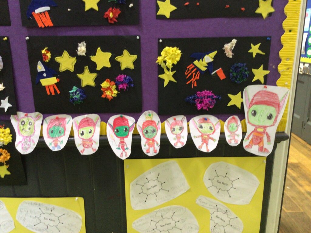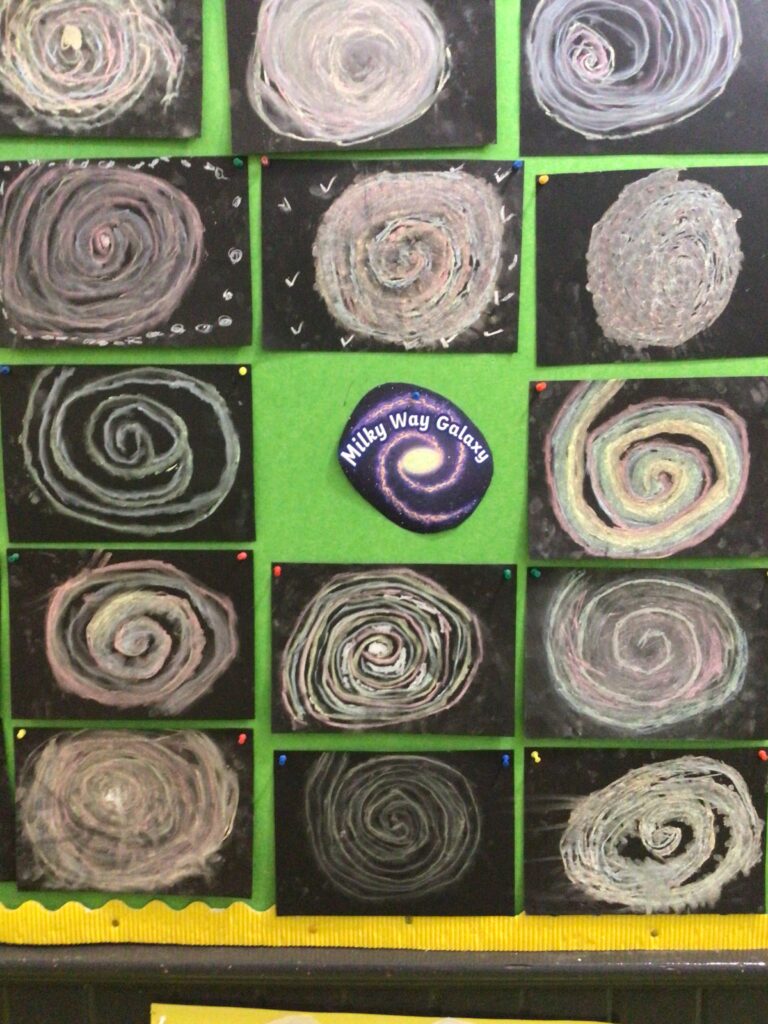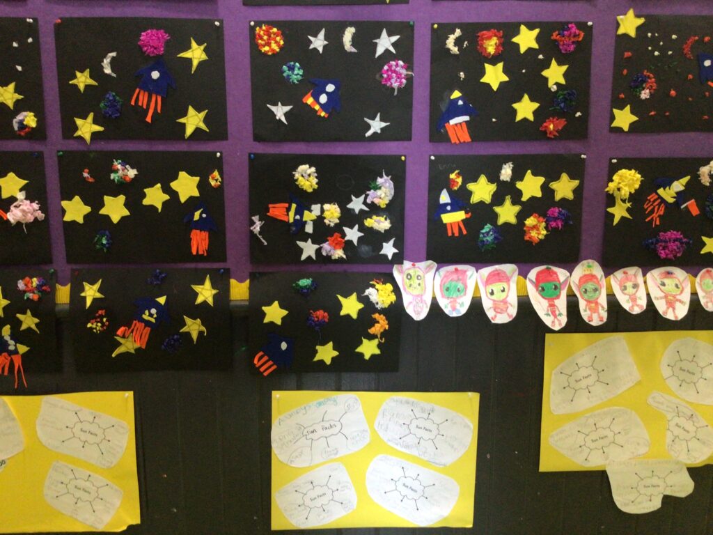 senior Infants explored the theme of space ,creating some fantastic rocket scenes using felt and crepe paper. The Milky Way galaxies were made using chalk. The class also learned some facts about the sun.