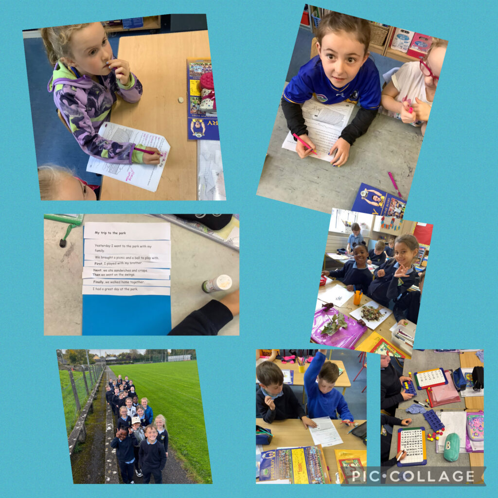 1st and 2nd classes are busy working on recount writing for English, addition for Maths and wellbeing /nature walk collecting leaves for their Autumn Art.