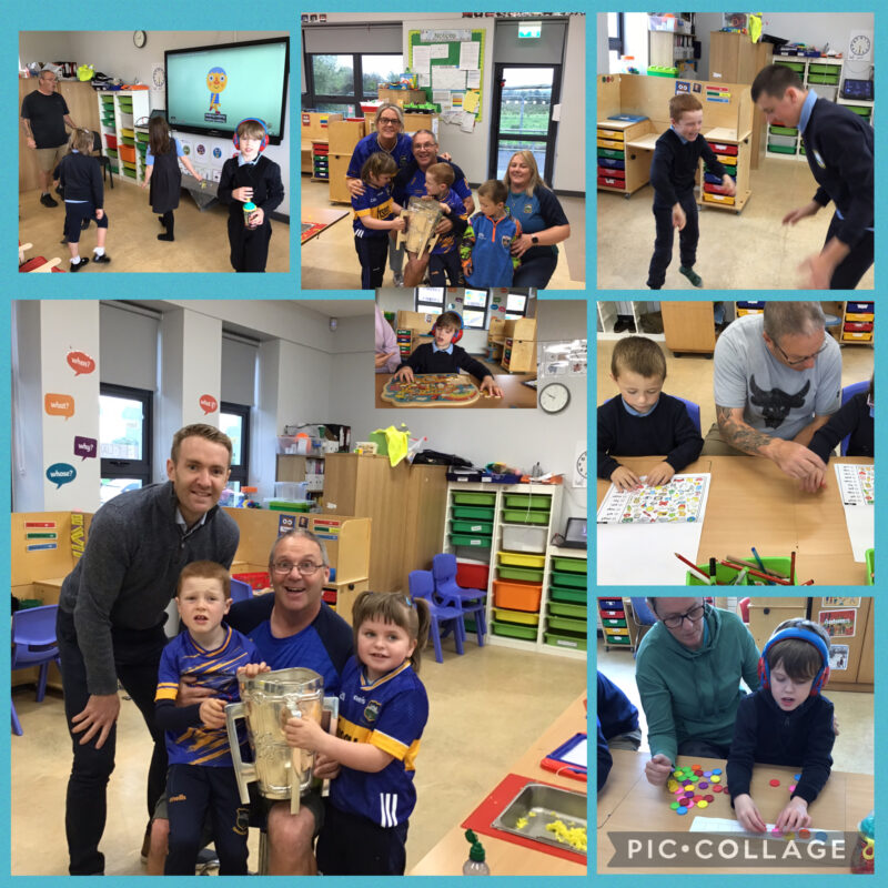 Paddy and his team Ashling, Elaine and Marie have had a busy month. Games,Art,cooking,giant Doppler and pattern work. Also a special mention to Noel McGrath who visited the school with the Liam Mc Carthy Cup . Finally, reverse integration with Senior Infants and Miss Levitchi was quite a lot of fun with stories told Wonky Donky, Monkey Puzzle and Freddy and The Fairy followed each time with musical statues.